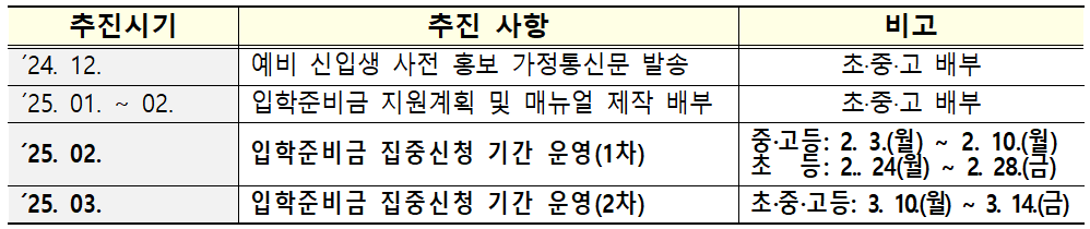 각 신청 기간 동안, 시작일 오전 9시부터 종료일 오후 6시까지 접수가 가능하며, 신청이 완료된 학생들은 학교별 확인 절차를 거쳐 중·고등학생은 2~3월 중, 초등학생은 3월 중 입학준비금을 지급받게 된다.