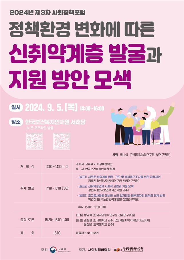 교육부는 5일 충북 청주에서 한국보건복지인재원과 공동으로 ‘정책환경 변화에 따른 신(新) 취약계층 발굴과 지원’을 주제로 제3차 사회정책 공개 토론회를 열었다. 이번 토론회에서는 최근의 사회 변화로 인해 새롭게 등장한 취약계층에 대한 정책적 대응 방안을 집중적으로 논의했다.