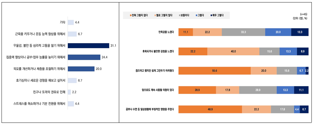 최근 6개월 내 의약품을 사용한 청소년들은 우울감이나 불안을 줄이기 위해 사용했다는 응답이 31.1%로 가장 많았고, 집중력 향상과 공부 효율을 높이기 위해 사용했다는 응답이 24.4%였다. 외모 관리나 체중 조절을 위한 사용도 20.0%를 차지했다.