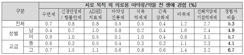 한국청소년정책연구원이 발표한 ‘청소년 유해약물 사용 실태 및 정책방안 연구’에 따르면, 중·고등학생의 5.3%가 치료 목적이 아닌 이유로 의약품을 사용한 경험이 있는 것으로 조사됐다.