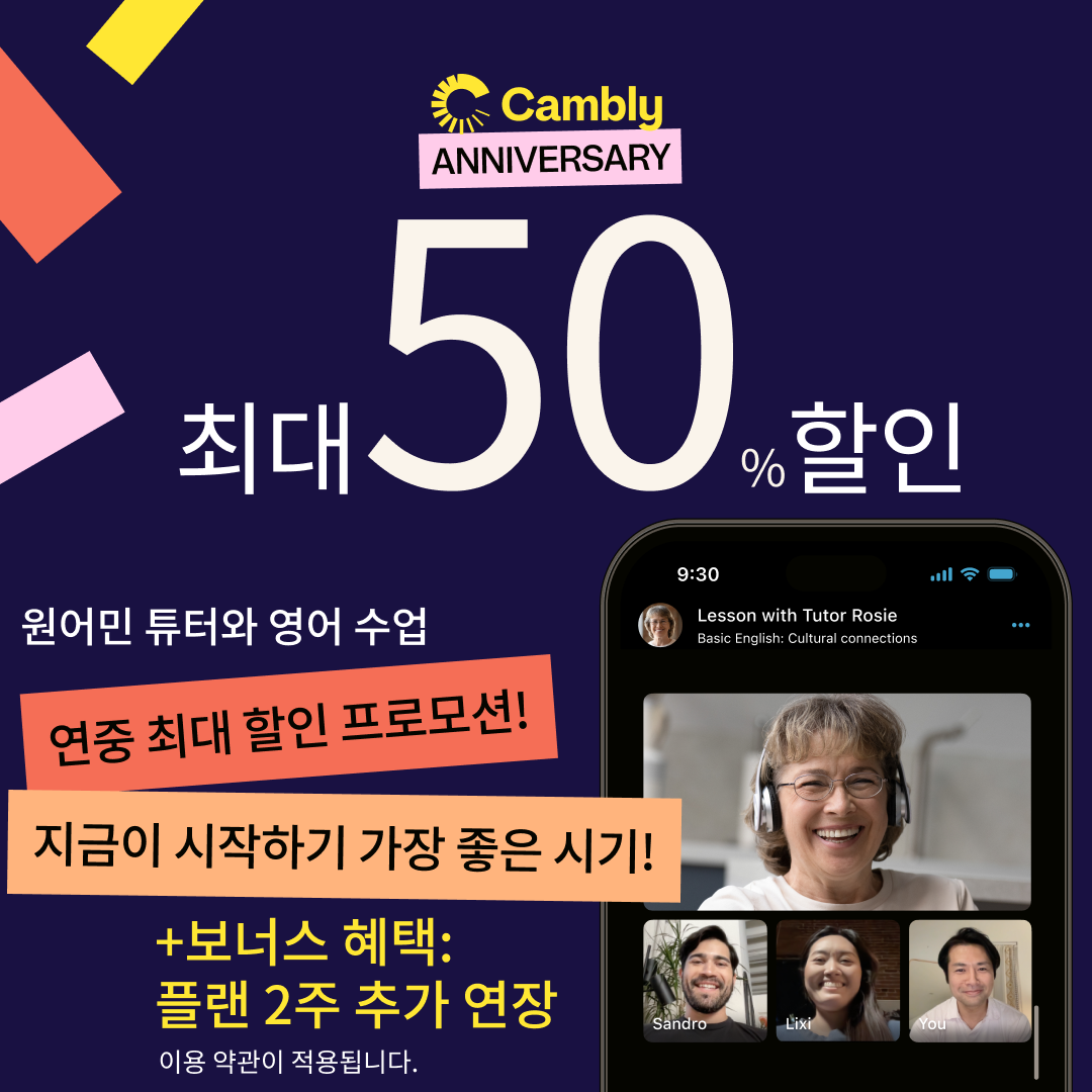 글로벌 화상영어 플랫폼 캠블리(Cambly)가 창립 13주년을 맞아 다양한 혜택을 담은 할인 프로모션을 진행한다. 이번 이벤트는 성인 및 어린이 대상 12개월 수업 플랜에 대해 최대 50% 할인을 제공하는 것으로, 일부 플랜에 한해 추가 수업과 기간 연장 혜택도 함께 주어진다.