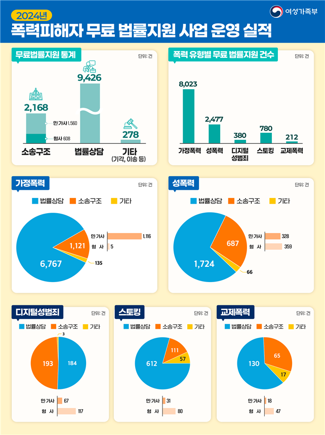 지난해 여성가족부의 법률지원 실적은 총 2,168건의 소송구조, 9,426건의 상담으로 나타났다. 특히 스토킹 관련 소송 지원은 2023년 47건에서 2024년 111건으로 두 배 이상 증가했으며, 교제폭력 관련 소송 구조도 26건에서 65건으로 큰 폭으로 늘었다.