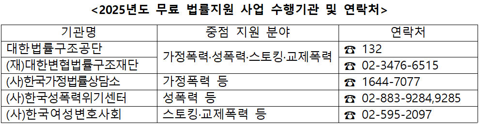현재 가정폭력, 성폭력(디지털 범죄 포함), 스토킹, 교제폭력 등 모든 폭력 피해자는 여성가족부를 비롯해 대한법률구조공단, 대한변협법률구조재단 등 5개 기관에서 맞춤형 지원을 받을 수 있다.