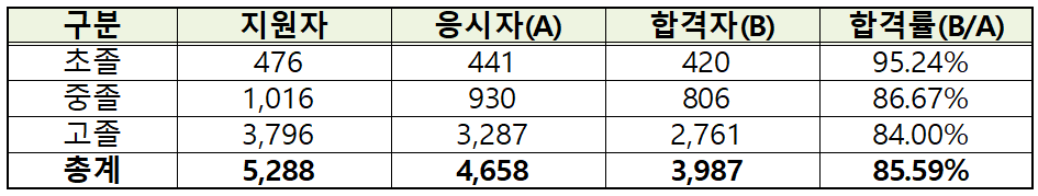 한편, 2025년도 제1회 검정고시는 총 4,658명이 응시해 3,987명이 합격, 전체 평균 합격률은 85.59%를 기록했다.