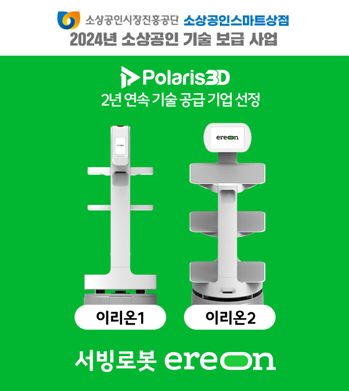 한편, 폴라리스쓰리디는 2023년에도 기술보급기업으로 선정된 바 있다. 실제 작년 소상공인 스마트상점 정부지원사업을 통해 서빙로봇 이리온을 도입한 경기도 성남시의 업체 관계자는 “서빙로봇 이리온의 경우 자부담금이 매우 낮고, 로봇 품질도 우수하여 직원처럼 믿고 맡길 수 있고, 매장 정보 변경으로 인해 상담이 필요한 경우에도 실시간 응대가 가능하여 매장 운영에 큰 도움을 받고 있다. 점점 올라가는 인건비와 구인난으로 고민이 큰 주위 소상공인들에게 적극 추천하고 있다”고 밝혔다.