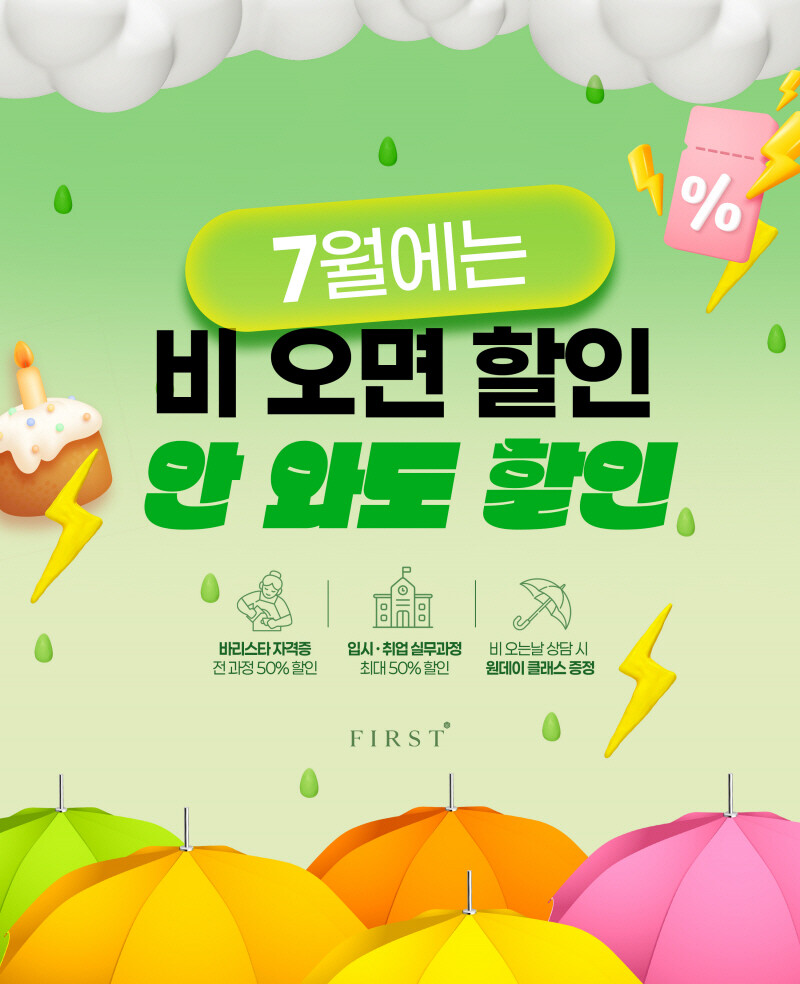 퍼스트바리스타제과제빵학원이 여름 장마철을 극복할 ‘7월엔 비 오면 할인, 안 와도 할인!’ 이벤트를 진행한다고 밝혔다.