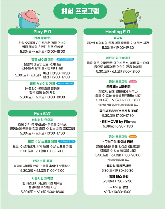 또한 ‘한강 운동회’에서는 올림픽 메달리스트 심석희, 이다빈, 조수연 등이 참가하는 미니게임, 단오를 기념한 전통놀이(단오부채 만들기, 씨름, 창포물 머리감기), 시민체력장 등 시민 참여형 행사가 이어진다.