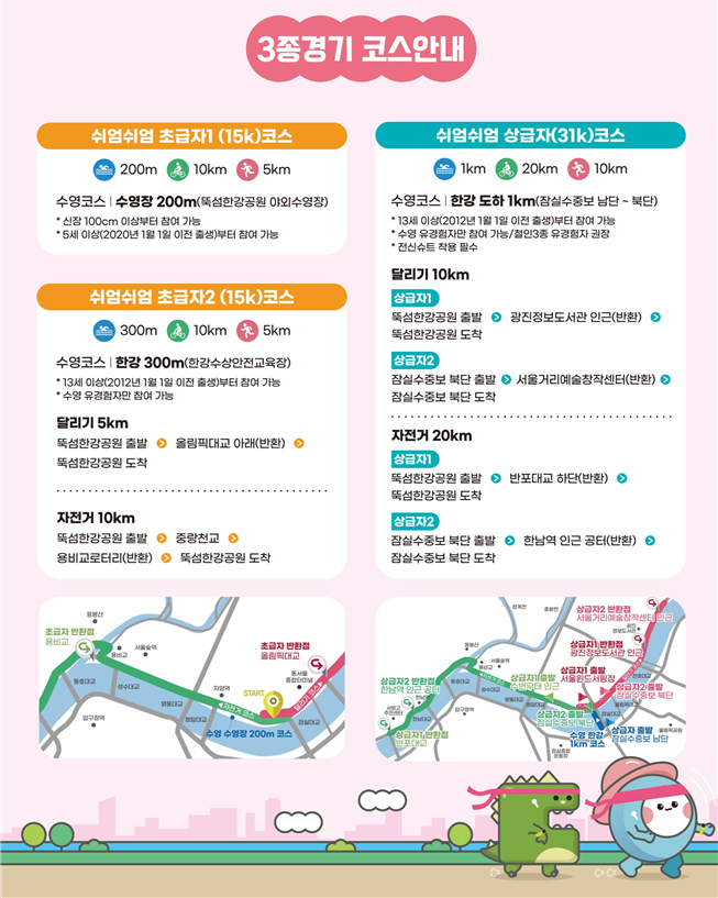 초급 코스는 수영 200m 또는 300m, 자전거 10km, 달리기 5km로 구성되고, 상급 코스는 한강 도하 수영 1km, 자전거 20km, 달리기 10km로 구성된다. 3개 종목을 모두 완수하면 개별 메달이 하나의 원형 메달로 완성돼 성취감을 선사한다.