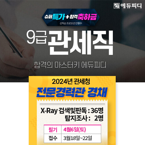 [피앤피뉴스=마성배 기자] 종합교육기업 에듀피디가 오는 4월 6일(토) 관세청 경력경쟁채용 ‘전문경력관 다군(X-Ray 검색 및 판독/탐지조사)’ 필기시험에 맞춰진 ‘30일 합격패키지’ 강좌와 함께 ‘슈퍼특가+합격축하금’ 프로모션을 오픈하고 수강생을 모집한다고 밝혔다.
