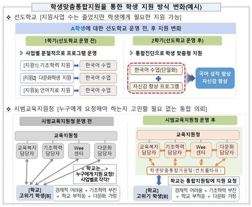교육부는 2022년 12월에 ‘학생맞춤통합지원 체계 구축 방안’을 발표하고 국가교육책임제 강화로 교육격차 해소를 위해 노력해왔으며, ‘조기 발견-맞춤형 지원-지역 및 정보 연계’를 통해 모든 학생의 전인적 성장을 돕는 학생 맞춤형 지원 체계로 개편을 지속적으로 추진해왔다.