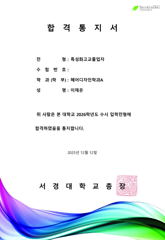 에르모소뷰티아카데미 대구캠퍼스에서 작년에 이어 또다시 2026년도 서경대학교 헤어디자인과 최종합격자를 배출했다고 밝혔다. 미용 전공 가운데서도 실기 비중과 경쟁률이 높은 학과로 꼽히는 서경대 헤어디자인과에 올해 최종합격자가 나오면서, 대구미용학원으로서의 입시 준비 성과가 다시 한 번 확인됐다.