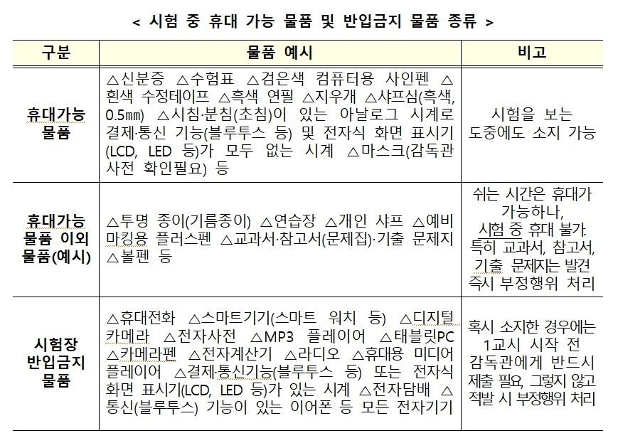 시험장에 꼭 시계를 휴대할 때에는 모든 전자식 시계는 안되고 오직 아날로그 시계만 휴대할 수 있다. 보청기, 돋보기 등 개인의 신체조건 또는 의료상 특별한 이유로 휴대가 필요한 물품은 매 교시 감독관의 사전 점검 후 휴대가 가능하다.