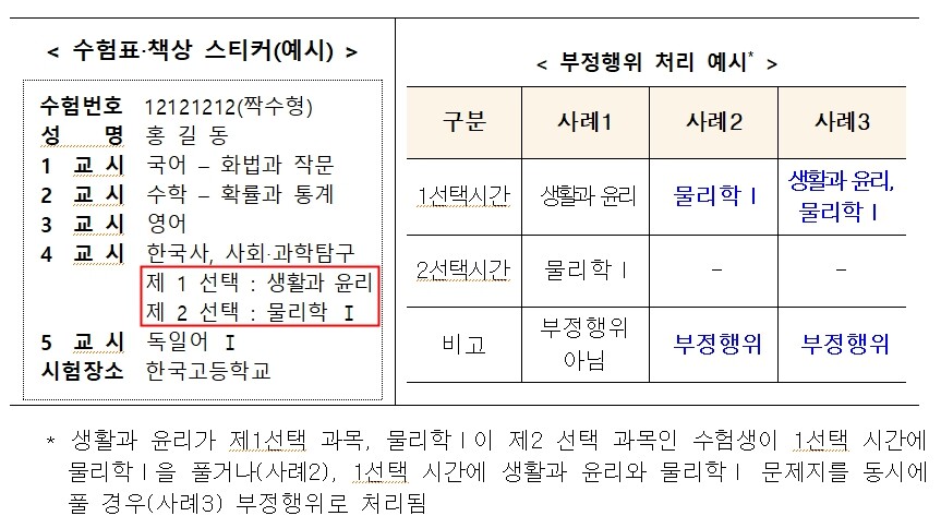 특히 주의할 점은 4교시 탐구 영역에서 2개 과목 응시를 선택한 수험생이 제2선택 과목 시간에 이미 종료된 제1선택 과목의 답안을 수정하거나 작성할 경우 부정행위 처리되어 해당 시험이 무효가 된다.