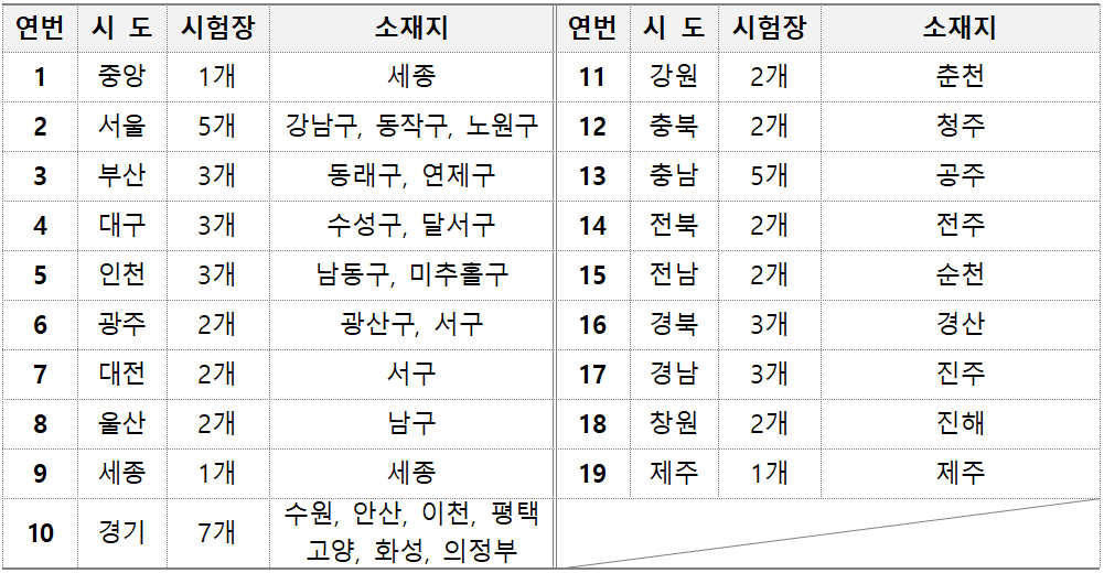 올해 시도별 필기시험 장소는 ▲중앙-새뜸중학교(세종) ▲서울-공채(경기고, 서울공고), 경채(청원고, 청원여고, 청원중) ▲부산-공채(부산전자공고, 연제중), 경채(여명중) ▲대구-공채(정화중, 송현여중), 경채(대구하이텍고) ▲인천-공채(구월중, 인천소방고), 경채(인천기계공고) ▲광주-공채(광주전자공고), 경채(광주상일중) ▲대전-공채(문정중), 경채(탄방중) ▲울산-공채(신일중), 경채(월평중) ▲세종-공채·경채(고운중) ▲경기도-공채(수원공고, 경일관광경영고, 이천 제일고, 효명중, 화수고), 경채(병점중, 신곡중) ▲강원도-공채(남춘천여중), 경채(춘천중) ▲충북-공채(원봉중), 경채(운동중) ▲충남-공채(공주중, 공주고), 경채(공주영명고, 공주금성여고, 공주정보고) ▲전북-공채(전주공고), 경채(전주동중) ▲전남-공채(순천남산중), 경채(순천청암고) ▲경북-공채(진량고, 진량중), 경채(경산여중) ▲경남-공채(진주기계공고, 진주동중), 경채(경남자동차고) ▲제주-공채·경채(한라중) ▲창원-공채(석동중), 경채(냉천중) 등 총 51개 시험장이다.
