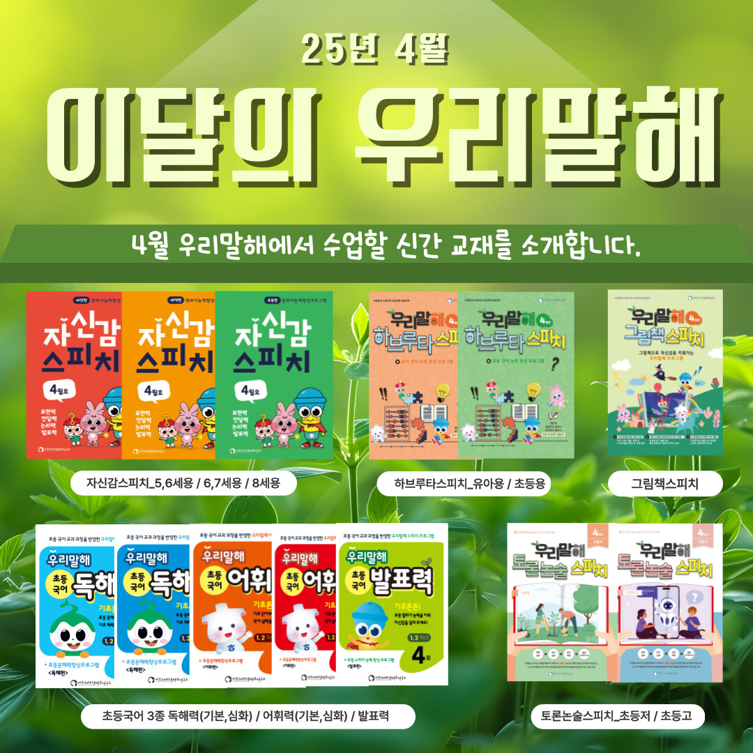 우리말해 교재는 매월 최신 이슈, 시사를 반영하여 새롭게 출간되고 있으며, 유아 연령별 스피치 콘텐츠 ‘자신감스피치’, ‘하브루타스피치’, ‘그림책스피치’와 초등 전용 스피치 콘텐츠 ‘초등국어 발표력’, ‘토론논술스피치’ 외 독해논술 기초를 다지는 논술 콘텐츠 ‘ 초등국어 어휘력, 독해력 ’ 교재를 기본편과 심화편으로 출간한다.