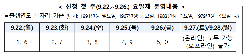 신청 기간은 오는 10월 31일 오후 6시까지이며, 신용·체크카드, 선불카드, 지역사랑상품권 중 원하는 방식을 선택할 수 있다. 다만 신청 첫 주(9월 22일~26일)는 온라인·오프라인 모두 출생연도 끝자리에 따른 요일제가 적용된다. 예컨대 출생연도 끝자리가 1·6이면 월요일, 2·7은 화요일에 신청할 수 있다.