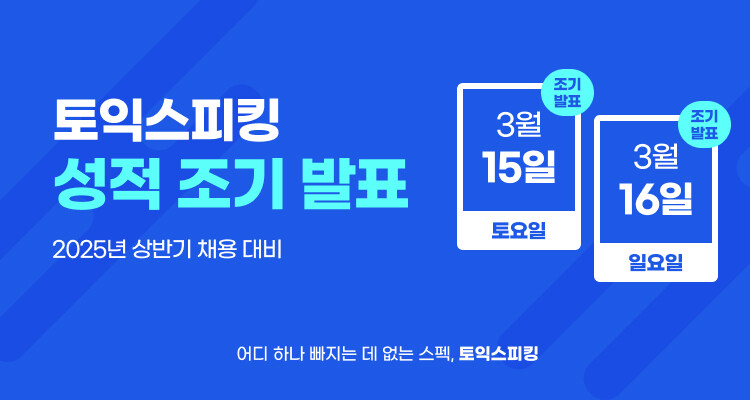 이에 따라 오는 3월 15일(토)과 16일(일)에 시행되는 토익스피킹 시험 성적은 공채 마감일인 17일(월) 정오와 오후 3시에 각각 발표될 예정이다.