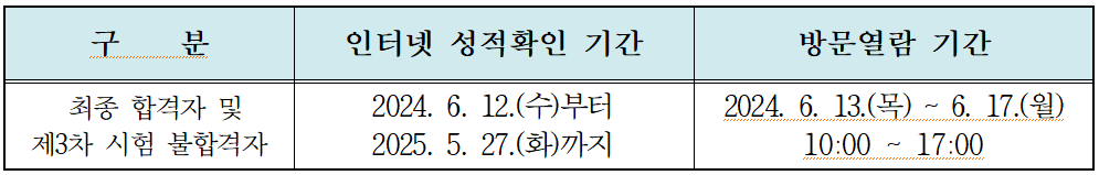 나. 제2차 시험 시험성적은 다음의 기간 중에 『대한민국 법원 시험정보 홈페이지』(http://exam.scourt.go.kr)/나의시험관리/성적조회 및 합격확인)에서 확인할 수 있고, 주민등록증 기타 공공기관 발행 신분증을 소지한 본인이 직접 법원행정처 인사운영심의담당실(대법원 동관 3층 제335호)에 방문하여 답안지(원본)를 열람할 수 있습니다(방문 전에 미리 전화를 주시기 바랍니다).