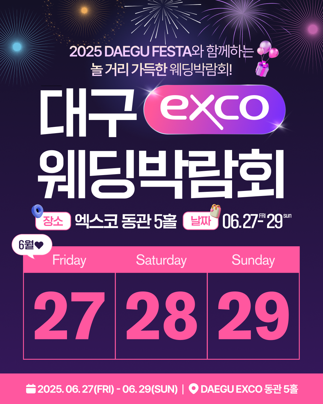 예비부부와 일반 시민을 위한 대형 전시 행사인 ‘2025 EXCO 웨딩박람회 in EXCO X 제1회 대구페스타’가 오는 6월 27일부터 29일까지 3일간 대구 북구 엑스코(EXCO) 동관 5홀에서 개최된다.