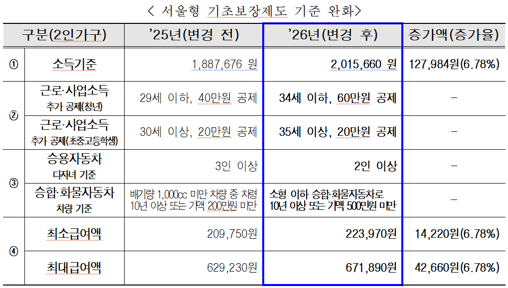서울시에 따르면 올해 제도 운영의 핵심은 생계급여 인상과 청년 지원 확대, 자동차 재산 기준 완화다. 생계급여는 1인 가구 기준으로 월 최대 7.2% 인상돼 기존 38만2,730원에서 41만280원으로 2만7,550원이 올랐다. 4인 가구의 경우 최대 6.5% 인상돼 월 97만5,650원에서 103만9,160원으로 6만3,510원이 증가했다.