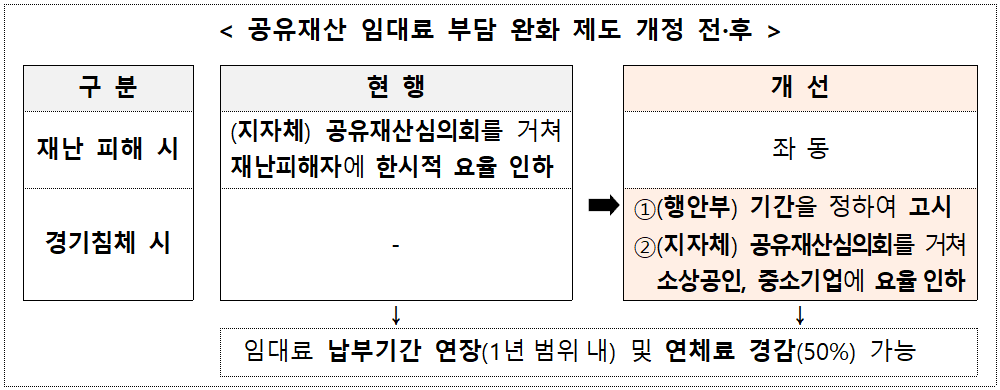 절차상 변화도 주목된다. 앞으로 경제위기 시, 행정안전부 장관이 위기 극복의 필요성을 판단해 고시를 통해 ‘임대료 감면 적용기간’을 정하면, 자치단체장은 공유재산심의회 심의를 거쳐 요율과 감면 폭을 자율적으로 정할 수 있다.