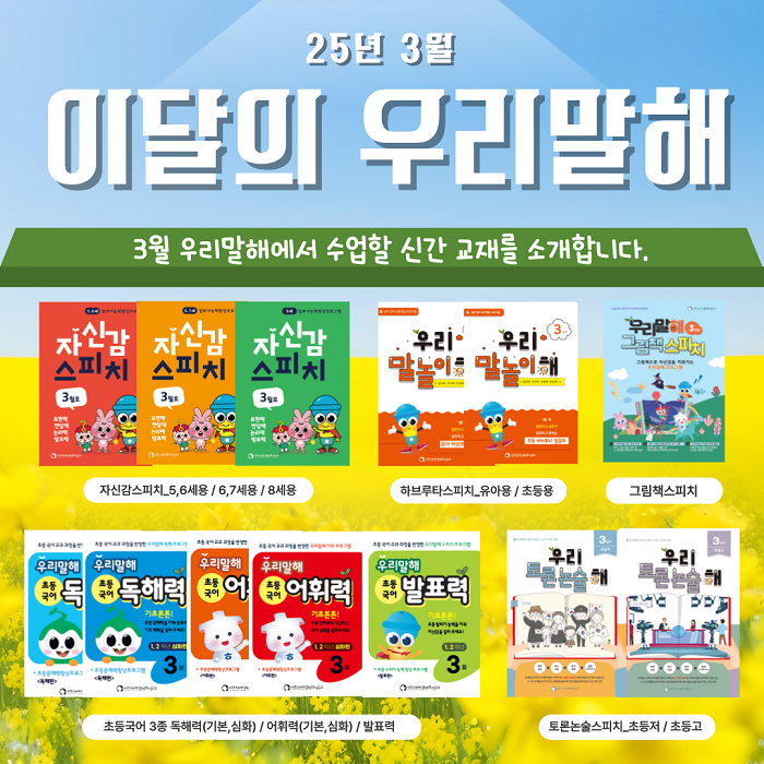 우리말해 교재는 매월 최신 이슈, 시사를 반영해 새롭게 출간되고 있으며, 유아 연령별 스피치 콘텐츠 ‘자신감스피치’, ‘하브루타스피치’, ‘그림책스피치’와 초등 전용 스피치 콘텐츠 ‘초등국어 발표력’, ‘토론논술스피치’ 외 독해논술 기초를 다지는 논술 콘텐츠 ‘초등국어 어휘력, 독해력’ 교재를 기본편과 심화편으로 출간한다.