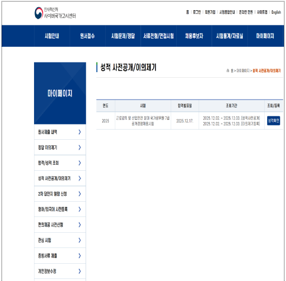 사전공개 기간 동안 응시자는 사이버국가고시센터(www.gosi.kr) → 로그인 → 마이페이지 → ‘성적 사전공개/이의제기’ 메뉴에서 과목별 점수를 조회할 수 있다. 필요할 경우 답안지 열람 신청도 가능하다.