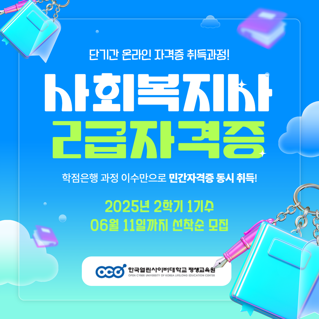 한국열린사이버대학교 평생교육원이 사회복지사2급 자격증 취득을 희망하는 학습자를 대상으로 2025년도 2학기 1차 수강생을 모집한다. 이번 과정은 고등학교 졸업 이상 학력을 가진 성인이면 누구나 지원 가능하며, 사회복지 분야의 전문성을 갖추고자 하는 예비 사회복지사들을 위한 실무 중심 교육과정으로 운영된다.