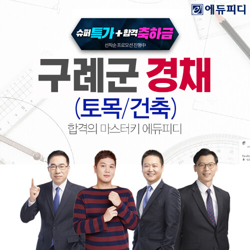 [피앤피뉴스=서광석 기자] 종합교육기업 에듀피디가 오는 5월 25일(토) 치러지는 제1회 전라남도 구례군 지방공무원 경력경쟁 임용시험에 맞춰 9급 토목직 및 건축직 공무원 시험에 대비할 수 있는 ‘합격패키지’ 인강을 오픈하고 수험생을 모집한다고 밝혔다.