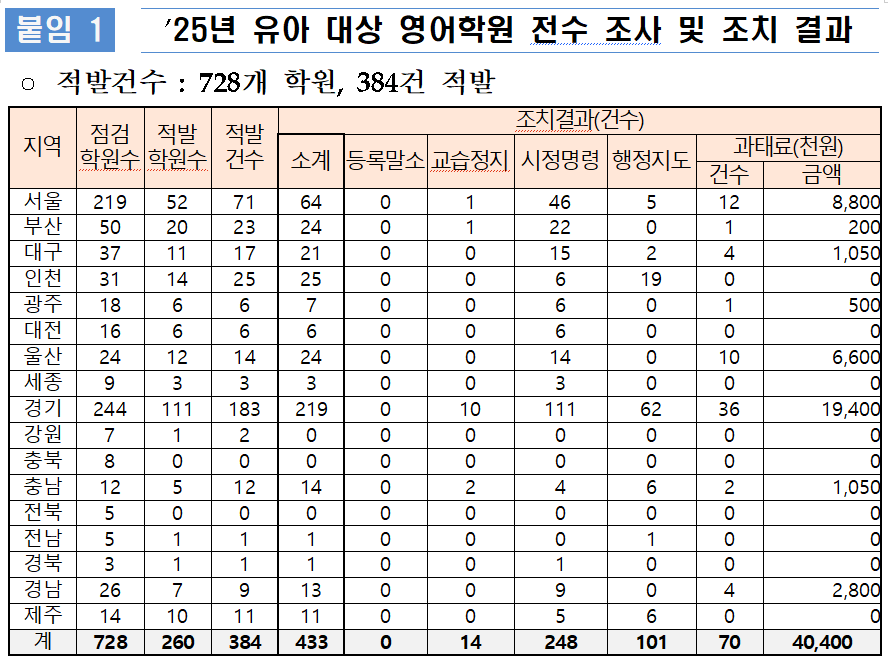 교육부(차관 최은옥)는 전국 유아 영어학원 728곳을 점검한 결과, 260개 학원에서 총 384건의 법령 위반을 적발했다고 4일 밝혔다.