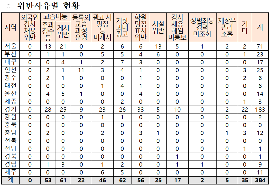 조사 기간은 지난 5월부터 7월까지였다. 점검 결과 위법 사항으로 △교습정지 14건 △과태료 70건(총 4천만 원) △벌점·시정명령 248건 △행정지도 101건 등 총 433건의 처분이 내려졌다.