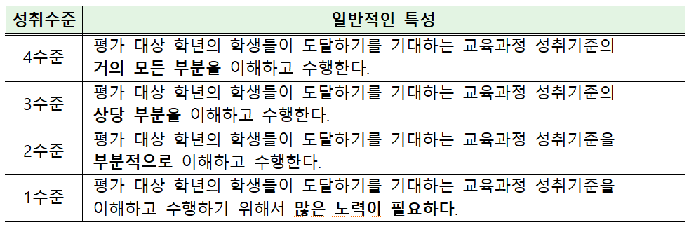 교과별 학업 성취 수준과 학교생활 만족도, 사회·정서적 역량 등 비인지적 특성을 진단했다. 학업 성취 수준은 4(우수 학력), 3(보통 학력), 2(기초 학력), 1(기초학력 미달)로 구분하고 있다.