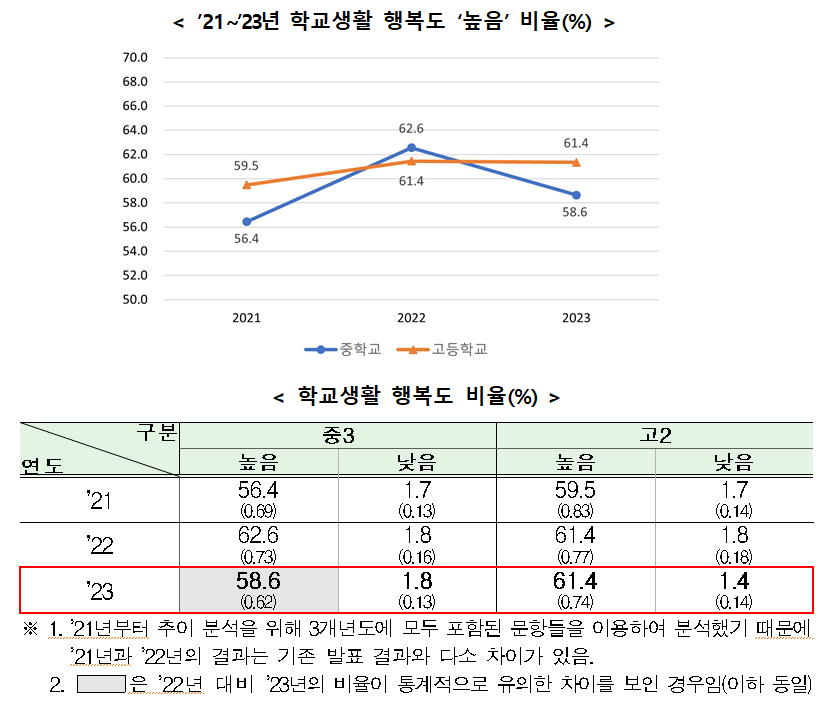 [피앤피뉴스=마성배 기자] 지난해 국가수준 학업성취도 평가 결과 중학교 학교생활 행복도는 전년보다 감소했고, 고등학교는 비슷한 수준을 보인 것으로 나타났다. 또한 중학교 영어 성취도가 큰 폭으로 상승했으며, 중·고등학교 국어, 영어에서 여학생의 학업성취도가 남학생에 비해 높았다.