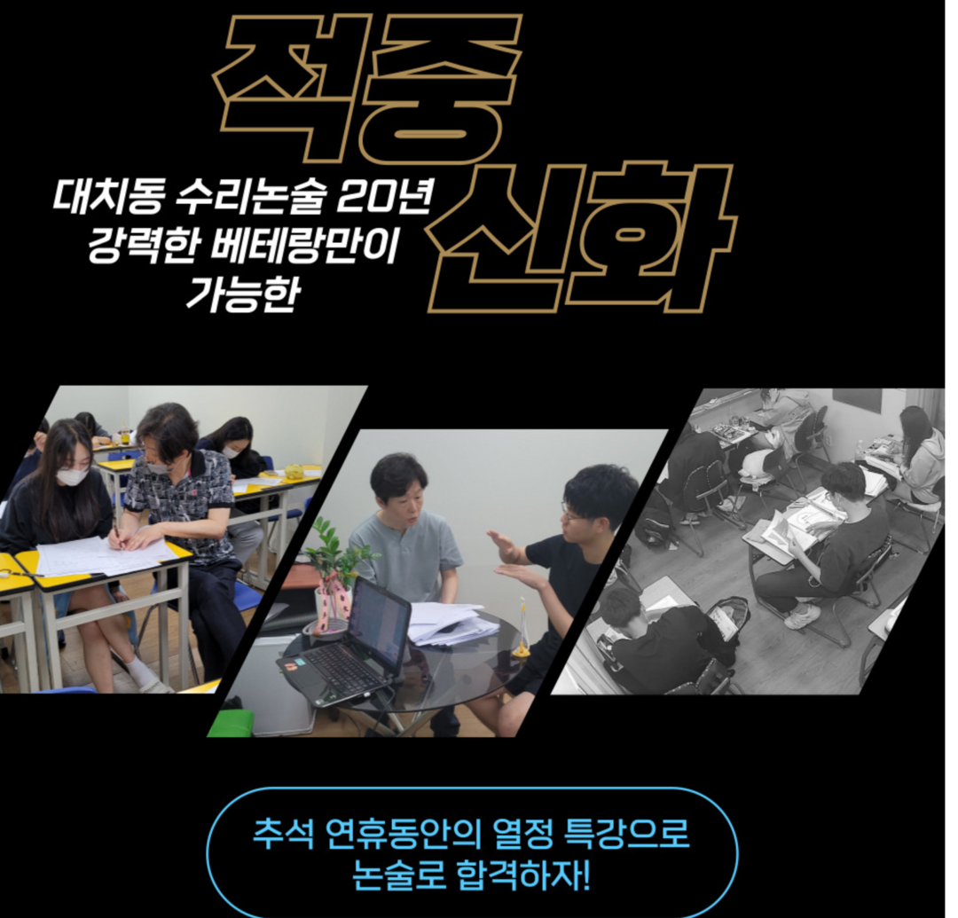대치동 멘토스학원은 소수정예 재수학원의 원조 학원으로 23년 된 대치동에서 메가스터디 다음으로 오래된 학원이다. 이 학원에서 5일간 수시 접수 후 실시 되는 수리논술, 약술형 논술 추석특강과 겨울방학 윈터스쿨을 접수중이다.