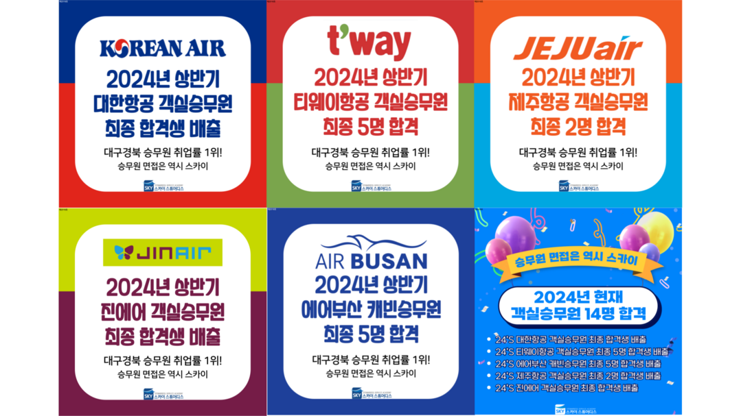 34년의 스카이교육그룹의 핵심 파트인 스카이승무원아카테미에서 34년 동안 1100명이 넘는 승무원을 배출하였고 현재 2024년 3월 기준 객실승무원 합격생이 14명이라고 29일 밝혔다. 대한항공 1명, 티웨이항공 5명, 에어부산 5명, 진에어 1명, 제주항공 2명 이렇게 합격하였다. 그리고 티웨이항공과 에어부산을 동시에 합격한 2명의 합격생도 있다.