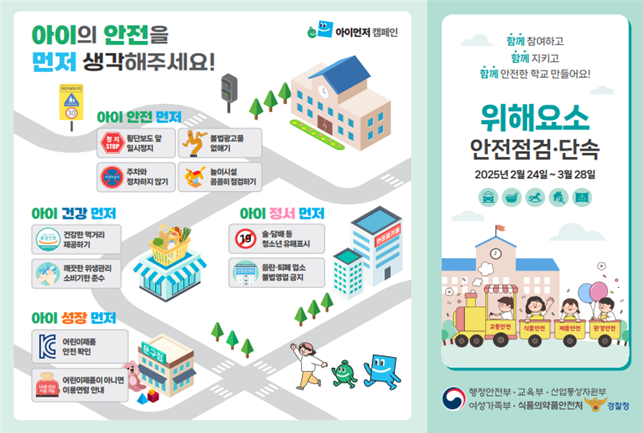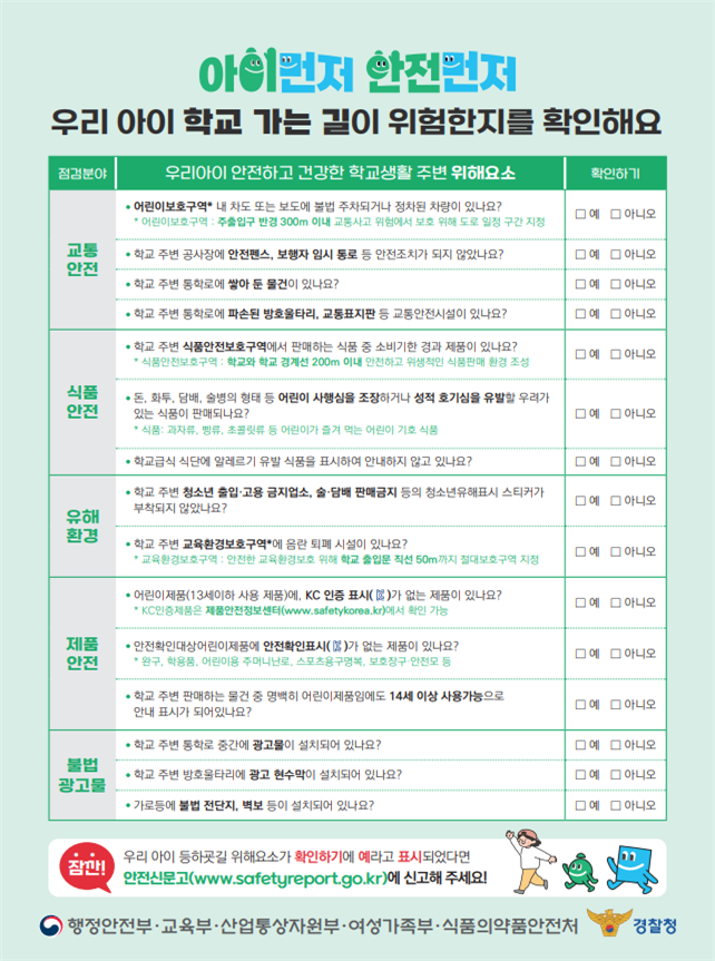 또한, 가정에서도 자녀가 안전한 환경에서 생활할 수 있도록 ‘아이먼저, 안전하고 건강한 학교생활 체크리스트’를 행정안전부 누리집에 배포할 예정이다.