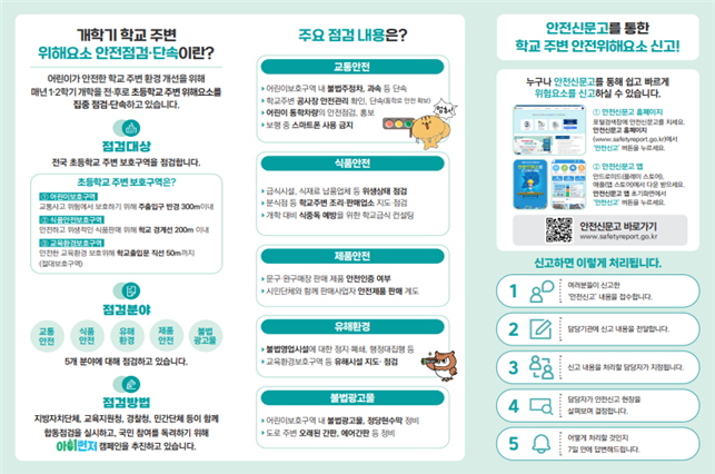 행안부는 국민 누구나 초등학교 주변 위해 요소를 신고할 수 있도록 ‘안전신문고’ 시스템을 운영 중이다. 불량 식품, 불법 광고물, 미인증 제품 등 발견 시 안전신문고 앱을 통해 신고 가능하다.