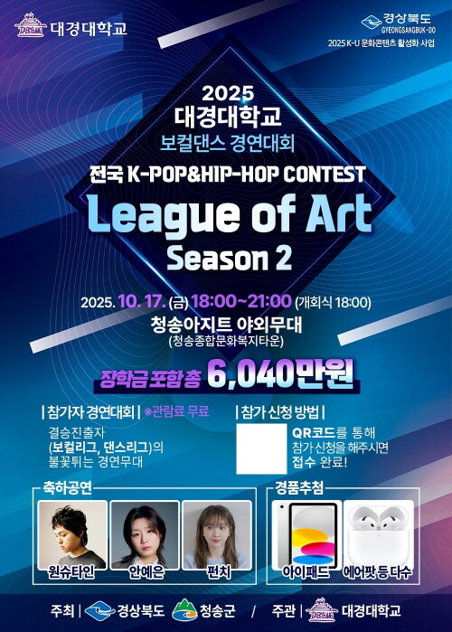 2025 전국 K-POP & HIPHOP 콘테스트인 ‘리그 오브 아트’가 오는 10월 17일 청송에서 개최된다. 경상북도와 청송군이 주최하고, 대경대학교가 주관하는 이번 대회는 보컬과 댄스의 진검 승부를 펼치는 경연의 장으로 다양한 참가자들이 참여해 그 실력을 겨룬다.