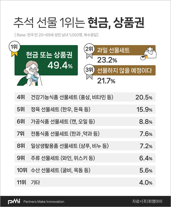 추석 선물 품목은 △현금·상품권(49.4%)이 압도적 1위를 차지했고, 이어 △과일 세트(23.2%) △선물 없음(21.7%) △건강기능식품(20.5%) △정육세트(15.9%) △가공식품(8.8%) △전통식품(7.6%) 순으로 집계됐다.