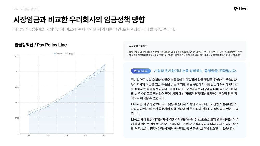 플렉스가 제공하는 임금분석 리포트는 크게 ‘임금 현황’과 ‘임금 경쟁력’ 두 축으로 구성된다.