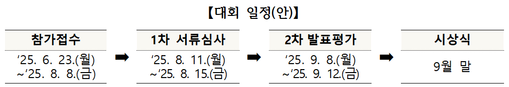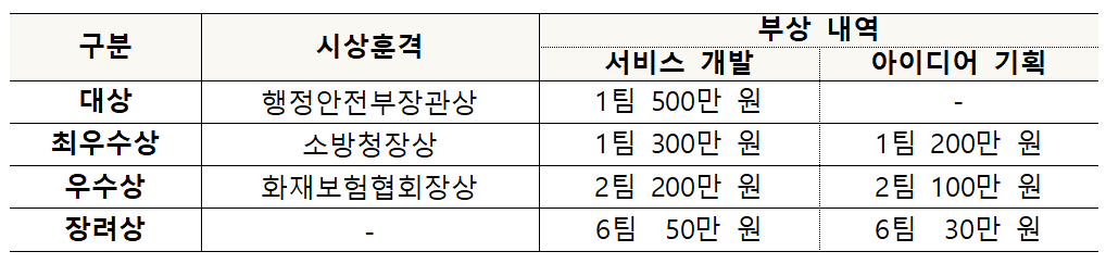 공모전 일정은 8월 중 1차 서류심사, 9월 초 2차 발표평가를 거쳐 9월 말 시상식으로 마무리된다. 시상은 행정안전부 장관상과 소방청장상, 화재보험협회장상 등 총 19개 팀을 대상으로 이루어지며, 상금은 총 2,080만 원이다. 대상은 1팀에게 수여되며, 상금은 500만 원이다.