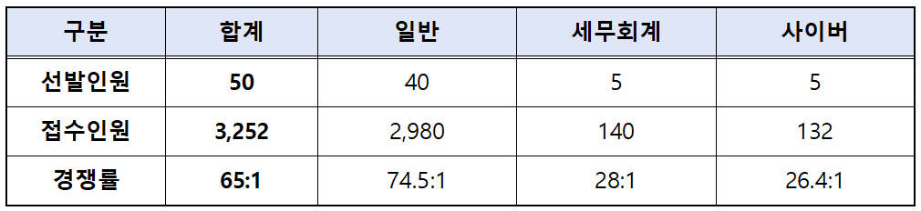 특히 일반 분야 경쟁률은 74.5대 1(40명 선발에 2,980명 지원)로 가장 높았고, 세무회계 분야는 28대 1(5명 선발에 140명 지원), 사이버 분야는 26.4대 1(5명 선발에 132명 지원)을 기록했다. 이는 지난해 각각 75대 1, 23.6대 1, 25대 1이었던 경쟁률과 비교할 때 일반은 소폭 하락했지만, 세무회계와 사이버는 지원자가 늘며 오히려 경쟁이 더 치열해졌다.