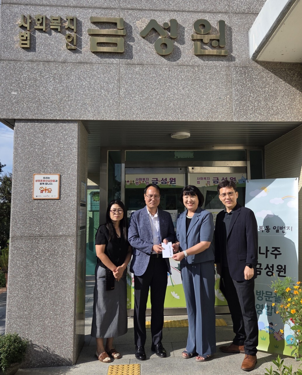 법무부가 운영하는 무료 법체험 공간인 광주솔로몬로파크는 지난 1일 나주 금성원과 영암 영애원을 방문해 직원들이 모은 ‘사랑의 손잡기’ 성금을 전달했다. 이번 후원은 지난해에 이어 이어진 나눔 활동으로, 올해는 기존 지원 기관인 나주 금성원 외에 직원들의 추천으로 영암 영애원까지 추가로 지원 대상에 포함됐다.