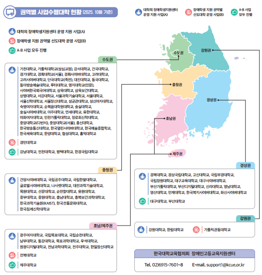 한편 교육부는 「장애인 등에 대한 특수교육법」 제33조에 따라 2024년 1월 31일 대교협을 장애인고등교육지원센터로 지정해 대학 재학 장애학생을 통합 지원하고 있다. 지난해에는 98개 대학에 교육지원 인력과 보조공학기기를 지원했고, ‘장애학생 지원 권역별 선도대학 운영 사업’을 통해 10개 대학을 선정해 진로 탐색부터 취업까지 연계 지원했다. 아울러 대학 담당자 직무교육과 자문(컨설팅), ‘대학의 장애학생 지원 매뉴얼’ 개정·배포 등 현장 전문성 강화도 병행했다.