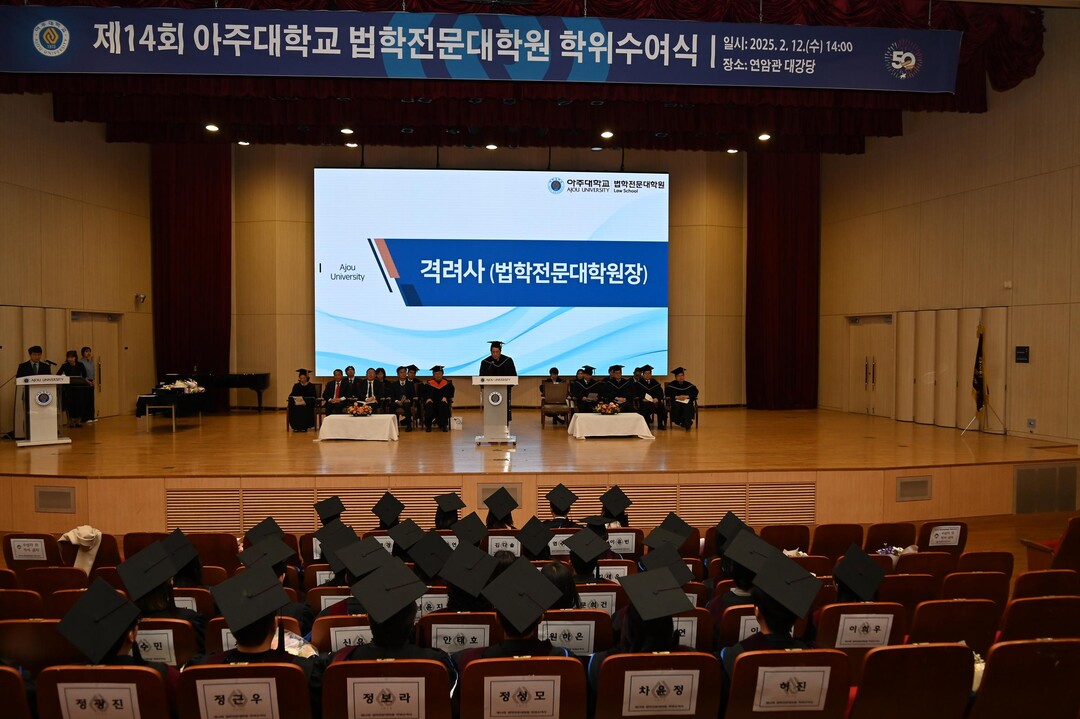 [피앤피뉴스=마성배 기자] 제14회 아주대학교 법학전문대학원 학위수여식이 2월 12일 연암관 대강당에서 개최됐다. 이번 행사에서는 이유빈 원생을 비롯한 총 50명이 석사 학위를 수여받았다.