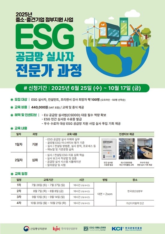 이번 과정은 EU 공급망 실사법(CSDDD)을 포함한 글로벌 ESG 규제에 대응할 수 있는 실무형 전문가 양성을 목표로 하며, 수료자에게는 민간 ESG 심사원 자격이 부여된다. 특히 우수 수료자에게는 실제 ESG 공급망 프로젝트 참여 기회도 제공될 예정이다.