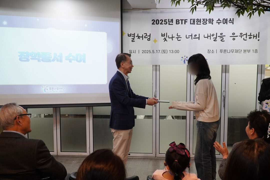 푸른나무재단(이사장 박길성)은 17일 서울 본부에서 ‘2025년도 대현장학생 장학증서 수여식’을 개최했다고 밝혔다. 이날 행사에는 박길성 이사장을 비롯해 장학생과 학부모, 추천자 및 선인장학재단 관계자 등 70여 명이 참석했다.