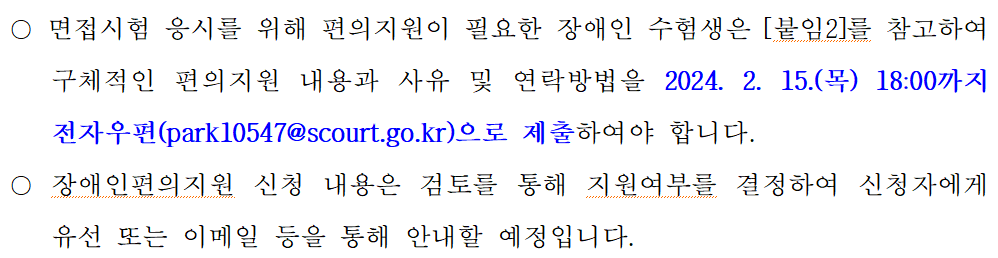○ 최종합격자는 2024. 3. 15.(금) 「대한민국 법원 시험정보」 인터넷 홈페이지(http://exam.scourt.go.kr/시험공고 및 공지사항/합격자발표)에 공고합니다.