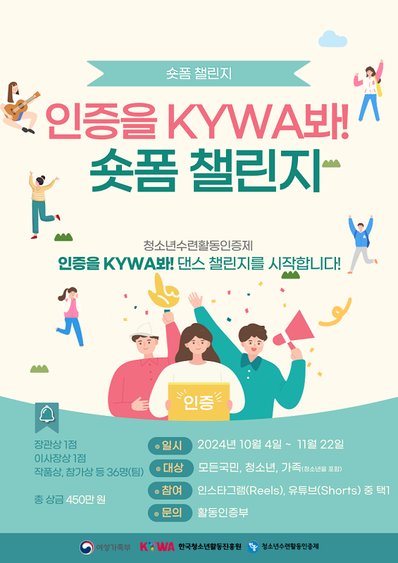 한국청소년활동진흥원, ‘인증을 KYWA봐! 숏폼 챌린지 공모전’ 개최