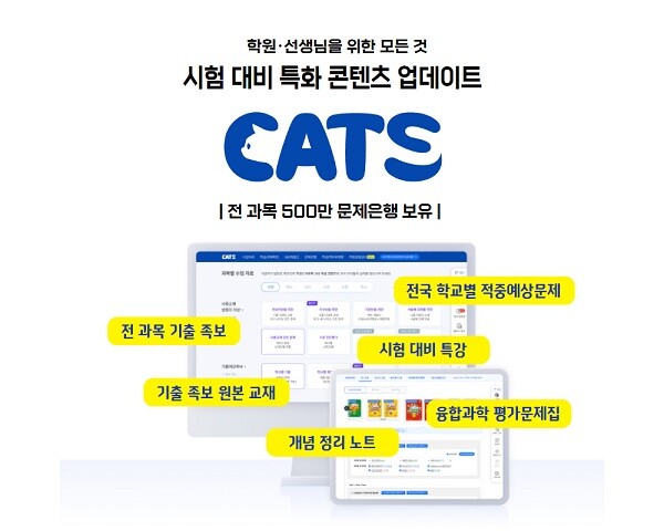 [피앤피뉴스=마성배 기자] 국내 학원용 무료 교수학습플랫폼 ’캐츠(cats)’가 전천후로 활용 가능한 ‘시험 대비 특화 콘텐츠’ 를 업데이트했다고 밝혔다.